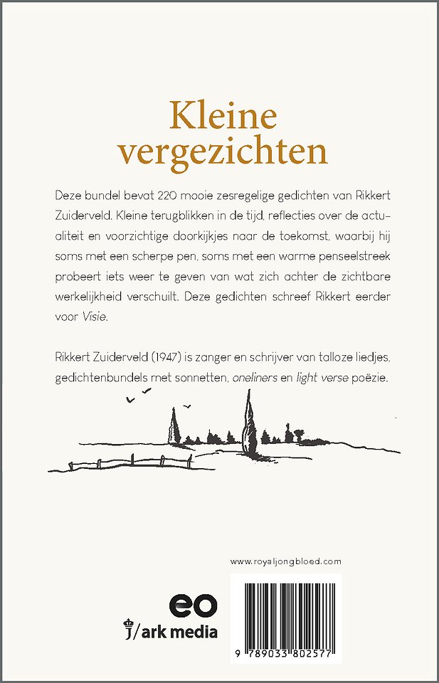 Kleine vergezichten is een bundeling van prachtige zesregelige gedichten die Rikkert Zuiderveld schreef voor het weekblad Visie. Kleine terugblikken in de tijd, reflecties over de actualiteit en voorzichtige doorkijkjes naar de toekomst, waarbij hij soms met een scherpe pen, soms met een warme penseelstreek probeert iets weer te geven van wat zich achter de zichtbare werkelijkheid verschuilt.