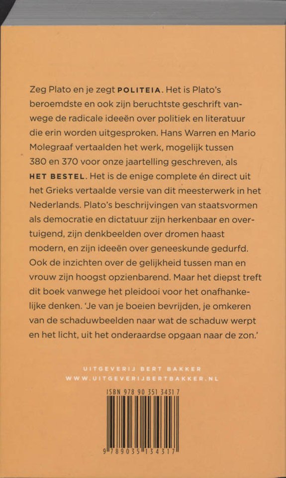 Zeg Plato en je zegt Politeia. Het is Plato's beroemdste en ook zijn beruchtste geschrift vanwege de radicale ideeën over politiek en literatuur die erin worden uitgesproken. Hans Warren en Mario Molegraaf vertaalden het werk, mogelijk tussen 380 en 370 voor onze jaartelling geschreven, als 'Het bestel'.