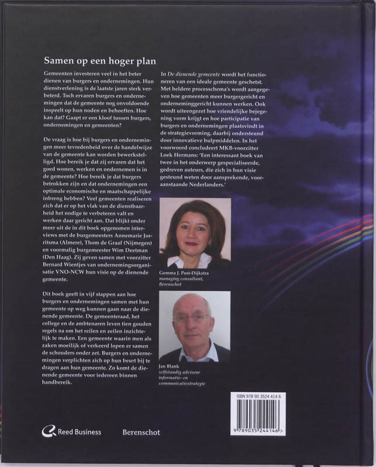 Dit boek geeft in vijf stappen aan hoe burgers en ondernemingen samen met hun gemeente op weg kunnen gaan naar de dienende gemeente. Het functioneren van een ideale gemeente wordt geschetst. Met heldere processchema's wordt aangegeven hoe gemeenten meer burgergericht en ondernemingsgericht kunnen werken. Ook wordt uiteengezet hoe vriendelijke bejegening vorm krijgt en hoe participatie van burgers en ondernemingen plaatsvindt in de strategievorming, daarbij ondersteund door innovatieve hulpmiddelen.