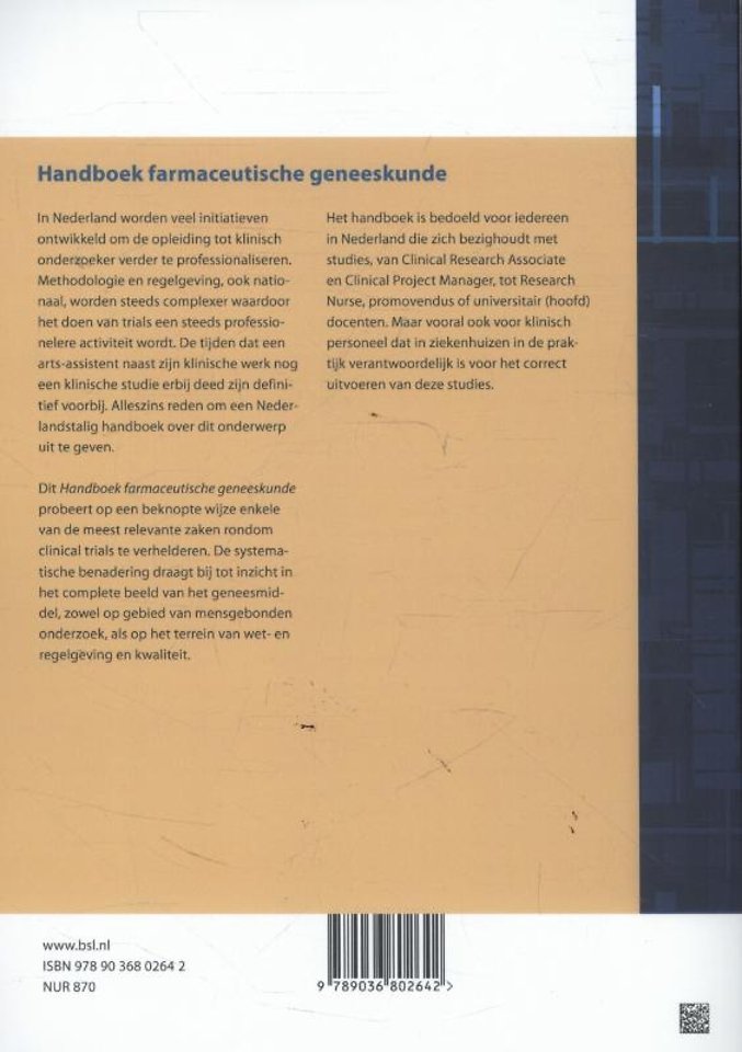 In Nederland worden veel initiatieven ontwikkeld om de opleiding tot klinisch onderzoeker verder te professionaliseren. Methodologie en regelgeving, ook nationaal, worden steeds complexer waardoor het doen van trials een steeds professionelere activiteit wordt. De tijden dat een arts-assistent naast zijn klinische werk nog een klinische studie erbij deed zijn definitief voorbij. Alleszins reden om een Nederlandstalig handboek over dit onderwerp uit te geven.Dit Handboek farmaceutische geneeskunde probeert op een beknopte wijze enkele van de meest relevante zaken rondom clinical trials te verhelderen. De systematische benadering draagt bij tot inzicht in het complete beeld van het geneesmiddel, zowel op gebied van mensgebonden onderzoek, als op het terrein van wet- en regelgeving en kwaliteit.