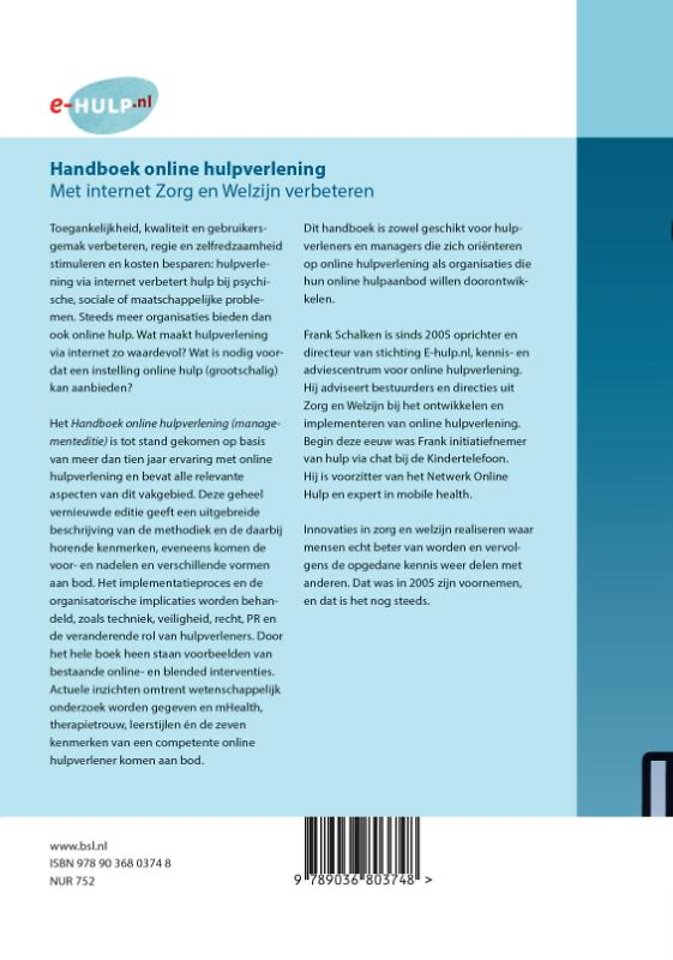 Het 'Handboek online hulpverlening (managementeditie)' is tot stand gekomen op basis van meer dan tien jaar ervaring met online hulpverlening en bevat alle relevante aspecten van dit vakgebied. Deze geheel vernieuwde editie geeft een uitgebreide beschrijving van de methodiek en de daarbij horende kenmerken, eveneens komen de voor- en nadelen en verschillende vormen aan bod. Het implementatieproces en de organisatorische implicaties worden behandeld, zoals techniek, veiligheid, recht, PR en de veranderende rol van hulpverleners. Door het hele boek heen staan voorbeelden van bestaande online- en blended interventies. Actuele inzichten omtrent wetenschappelijk onderzoek worden gegeven en mHealth, therapietrouw, leerstijlen én de zeven kenmerken van een competente online hulpverlener komen aan bod.