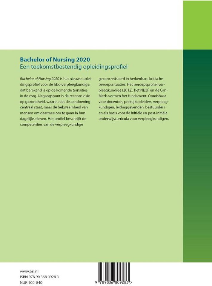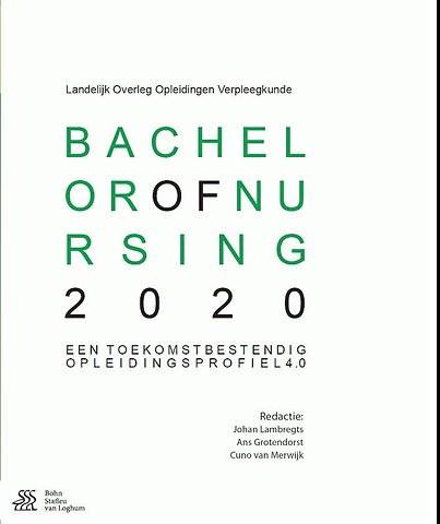 Bachelor Nursing 2020 is het nieuwe opleidingsprofiel voor de hbo-verpleegkundige, dat berekend is op de komende transities in de zorg. Uitgangspunt is de recente visie op gezondheid, waarin niet de aandoening centraal staat, maar de bekwaamheid van mensen om daarmee om te gaan in hun dagelijkse leven. Het profiel beschrijft de competenties van de verpleegkundige geconcretiseerd in herkenbare kritische beroepssituaties. Het beroepsprofiel verpleegkundige (2012), het NLQF en de CanMeds vormen het fundament. Onmisbaar voor docenten, praktijkopleiders, verpleegkundigen, leidinggevenden, bestuurders en als basis voor de initiële en post-initiële onderwijscurricula voor verpleegkundigen.