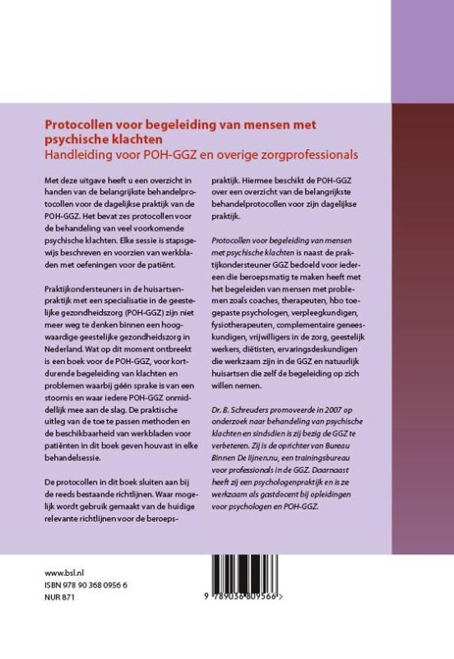 Met deze uitgave heeft u een overzicht in handen van de belangrijkste behandelprotocollen voor de dagelijkse praktijk van de POH-GGZ. Het bevat zes protocollen voor de behandeling van veel voorkomende psychische klachten. Elke sessie is stapsgewijs beschreven en voorzien van werkbladen met oefeningen voor de patiënt. Praktijkondersteuners in de huisartsenpraktijk met een specialisatie in de geestelijke gezondheidszorg (POH-GGZ) zijn niet meer weg te denken binnen een hoogwaardige geestelijke gezondheidszorg in Nederland. Wat op dit moment ontbreekt is een boek voor de POH-GGZ, voor kortdurende begeleiding van klachten en problemen waarbij géén sprake is van een stoornis en waar iedere POH-GGZ onmiddellijk mee aan de slag. De praktische uitleg van de toe te passen methoden en de beschikbaarheid van werkbladen voor patiënten in dit boek geven houvast in elke behandelsessie.De protocollen in dit boek sluiten aan bij de reeds bestaande richtlijnen. Waar mogelijk wordt gebruik gemaakt van de huidige relevante richtlijnen voor de beroepspraktijk. Hiermee beschikt de POH-GGZ over een overzicht van de belangrijkste behandelprotocollen voor zijn dagelijkse praktijk. Protocollen voor begeleiding van mensen met psychische klachten is naast de praktijkondersteuner GGZ bedoeld voor iedereen die beroepsmatig te maken heeft met het begeleiden van mensen met problemen zoals coaches, therapeuten, hbo toegepaste psychologen, verpleegkundigen, fysiotherapeuten, complementaire geneeskundigen, vrijwilligers in de zorg, geestelijk werkers, diëtisten, ervaringsdeskundigen die werkzaam zijn in de GGZ en natuurlijk huisartsen die zelf de begeleiding op zich willen nemen. Dr. B. Schreuders promoveerde in 2007 op onderzoek naar behandeling van psychische klachten en sindsdien is zij bezig de GGZ te verbeteren. Zij is de oprichter van Bureau Binnen De Lijnen.nu, een trainingsbureau voor professionals in de GGZ. Daarnaast heeft zij een psychologenpraktijk en is ze werkzaam als gastdocent bij opleidingen voor psychologen en POH-GGZ.