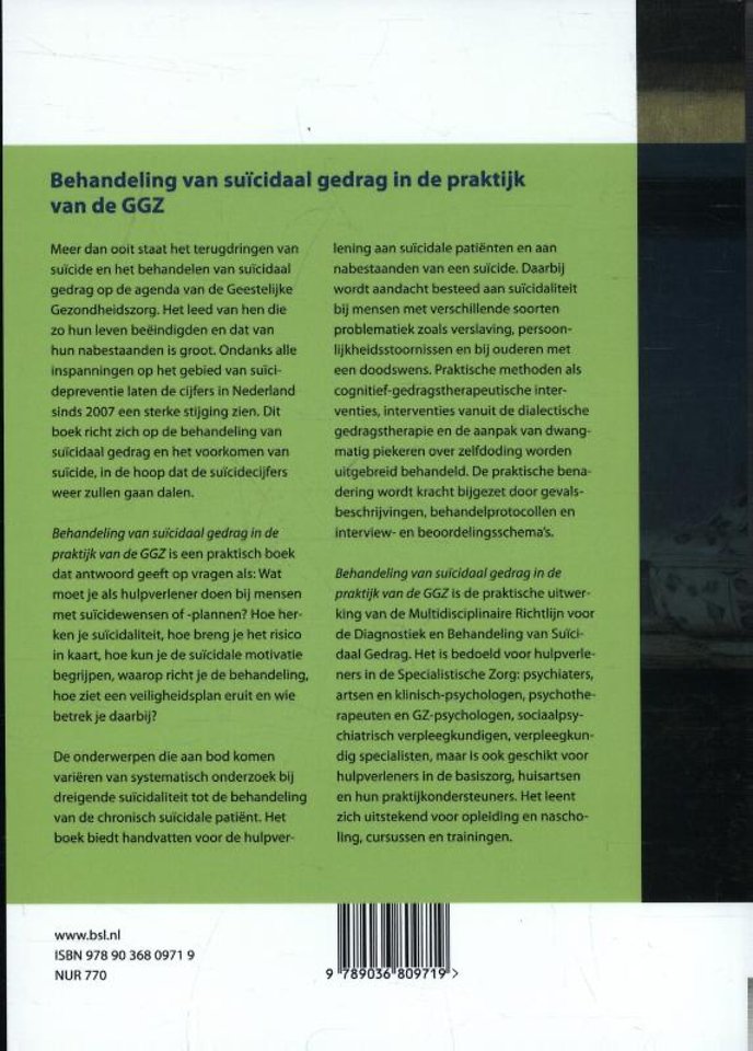 Behandeling van suïcidaal gedrag in de praktijk van de GGZ is de praktische uitwerking van de Multidisciplinaire Richtlijn voor de Diagnostiek en Behandeling van suïcidaal gedrag. Het is bedoeld voor hulpverleners in de Specialistische Zorg: psychiaters, artsen en klinisch-psychologen, psychotherapeuten en GZ-psychologen, sociaalpsychiatrisch verpleegkundigen, verpleegkundig specialisten, maar is ook geschikt voor hulpverleners in de basiszorg, huisartsen en hun praktijkondersteuners. Het leent zich uitstekend voor opleiding en nascholing, cursussen en trainingen.