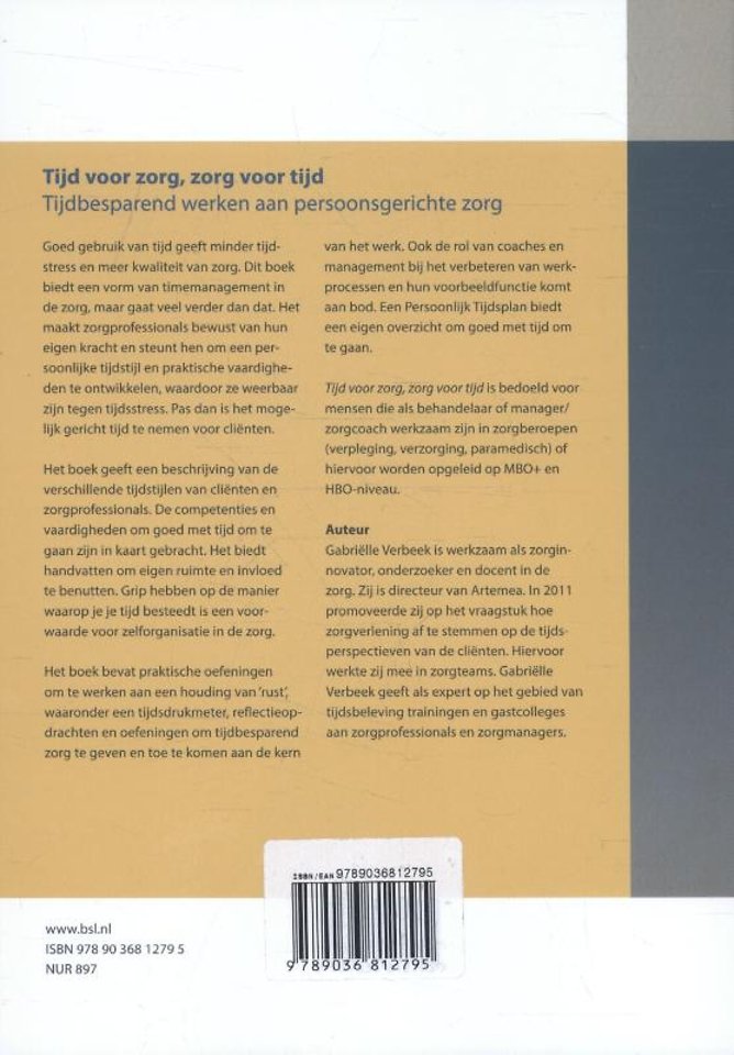 Goed gebruik van tijd geeft minder tijdstress en meer kwaliteit van zorg. Dit boek biedt een vorm van timemanagement in de zorg, maar gaat veel verder dan dat. Het maakt zorgprofessionals bewust van hun eigen kracht en steunt hen om een persoonlijke tijdstijl en praktische vaardigheden te ontwikkelen, waardoor ze weerbaar zijn tegen tijdsstress. Pas dan is het mogelijk gericht tijd te nemen voor cliënten.