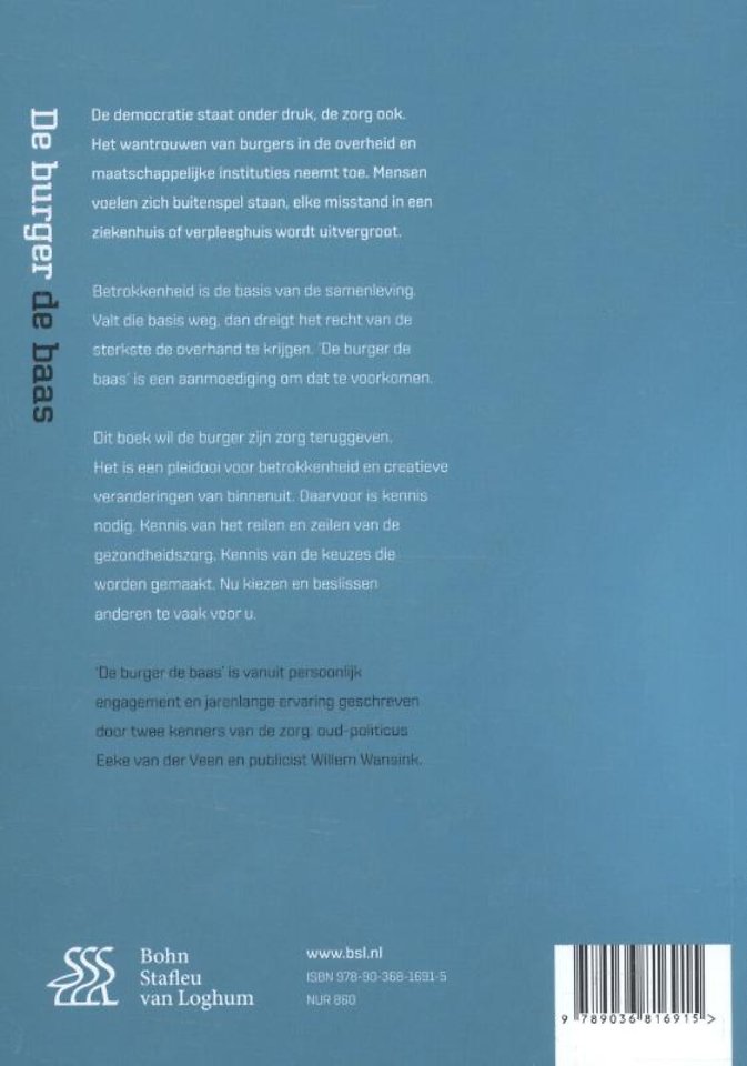 ‘De burger de baas’ is vanuit persoonlijk engagement en jarenlange ervaring geschreven door twee kenners van de zorg: oud-politicus Eeke van der Veen en publicist Willem Wansink.