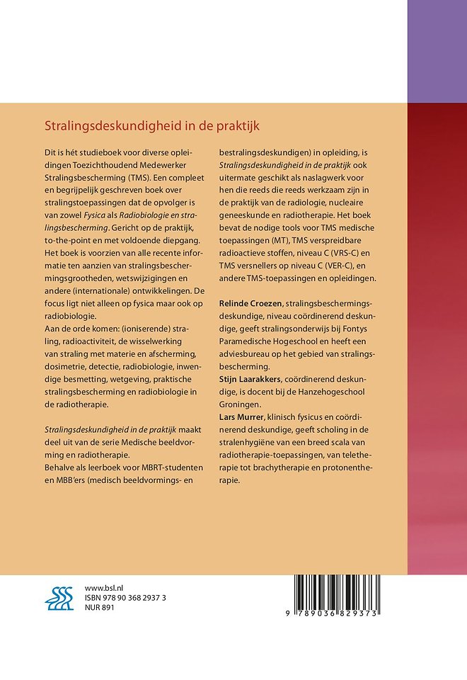 Dit is hét studieboek voor diverse opleidingen Toezichthoudend Medewerker Stralingsbescherming (TMS). Een compleet en begrijpelijk geschreven boek over stralingstoepassingen dat de opvolger is van zowel Fysica als Radiobiologie en stralingsbescherming. Gericht op de praktijk, to-the-point en met voldoende diepgang. Het boek is voorzien van alle recente informatie ten aanzien van stralingsbeschermingsgrootheden, wetswijzigingen en andere (internationale) ontwikkelingen. De focus ligt niet alleen op fysica maar ook op radiobiologie. Aan de orde komen: (ioniserende) straling, radioactiviteit, de wisselwerking van straling met materie en afscherming, dosimetrie, detectie, radiobiologie, inwendige besmetting, wetgeving, praktische stralingsbescherming en radiobiologie in de radiotherapie. Stralingsdeskundigheid in de praktijk maakt deel uit van de serie Medische beeldvorming en radiotherapie.