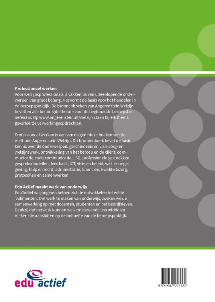 Professioneel werken is één van de basisdelen van de methode Angerenstein Welzijn. Dit bronnenboek bevat de basiskennis over de onderwerpen: geschiedenis en visie zorg- en welzijnswerk, ontwikkeling van het beroep en de cliënt, communicatie, metacommunicatie, LSD, professionele gesprekken, gespreksmodellen, feedback, ICT, visie en beleid, wet- en regelgeving, hulp en recht, administratie, financiën, kwaliteitszorg, protocollen en samenwerken.