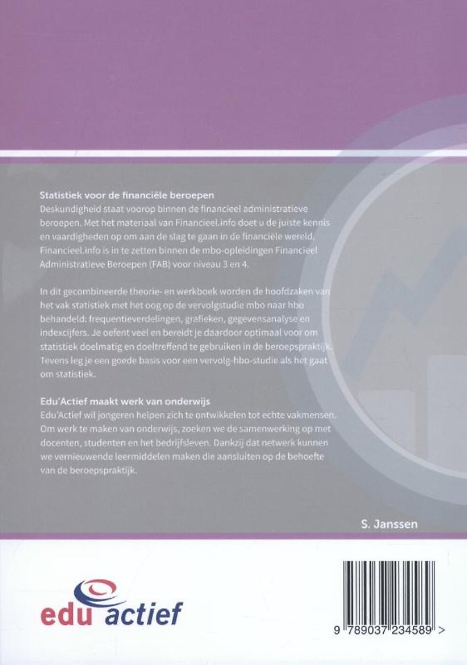 In dit gecombineerde theorie- en werkboek worden de hoofdzaken van het vak statistiek met het oog op de vervolgstudie mbo naar hbo behandeld: frequentieverdelingen, grafieken, gegevensanalyse en indexcijfers. Uw student oefent veel en bereidt zich daardoor optimaal voor om statistiek doelmatig en doeltreffend te gebruiken in de beroepspraktijk. Tevens legt uw student een goede basis voor een vervolg-hbo-studie als het gaat om statistiek.