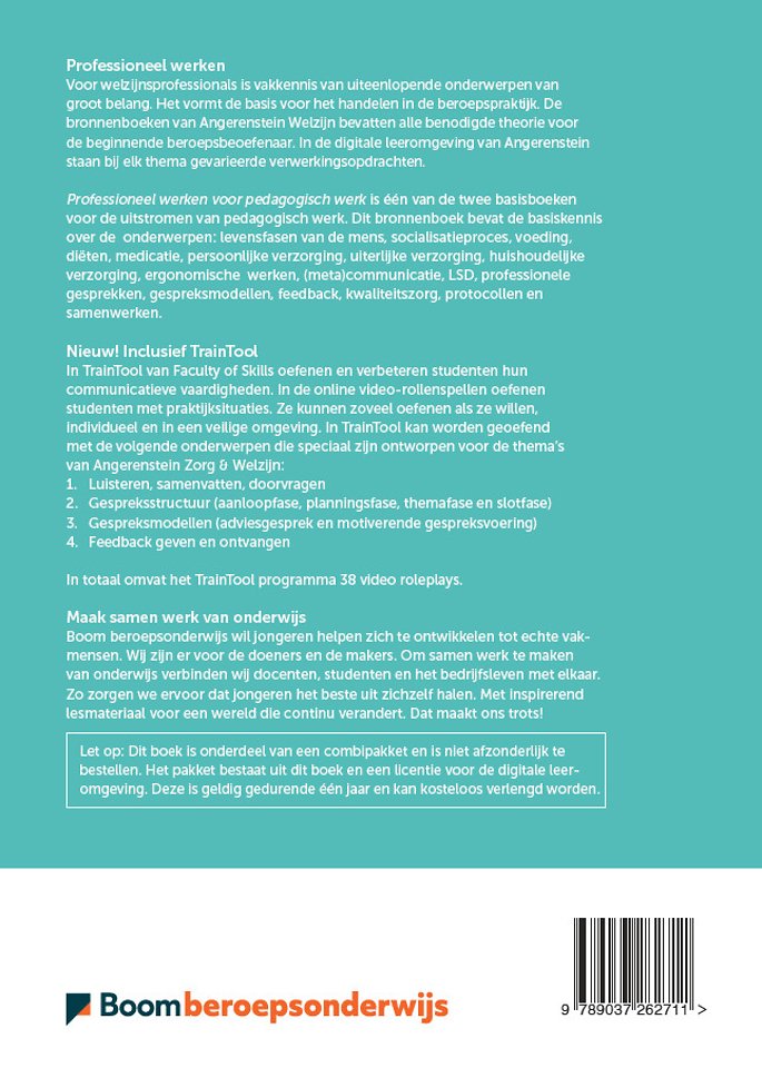 Voor welzijnsprofessionals is vakkennis van uiteenlopende onderwerpen van groot belang. Het vormt de basis voor het handelen in de beroepspraktijk. De bronnenboeken van Angerenstein Welzijn bevatten alle benodigde theorie voor de beginnende beroepsbeoefenaar. In de digitale leeromgeving van Angerenstein staan bij elk thema gevarieerde verwerkingsopdrachten.