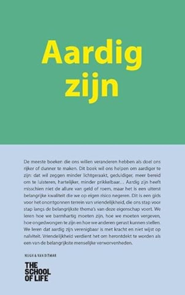 De meeste boeken die ons willen veranderen hebben als doel ons rijker of dunner te maken. Dit boek wil ons helpen om aardiger te zijn: dat wil zeggen minder lichtgeraakt, geduldiger, meer bereid om te luisteren, hartelijker, minder prikkelbaar… Aardig zijn heeft misschien niet de allure van geld of roem, maar het is een uiterst belangrijke kwaliteit die we op eigen risico negeren. Dit is een gids voor het onontgonnen terrein van vriendelijkheid, die ons stap voor stap langs de belangrijkste thema’s van deze kwaliteit voert. We leren hoe we barmhartig moeten zijn, hoe we moeten vergeven, hoe ongedwongen te zijn en hoe we anderen gerust kunnen stellen. We leren dat aardig zijn verenigbaar is met kracht en niet wijst op naïviteit. Vriendelijkheid verdient het om herontdekt te worden als een van de belangrijkste menselijke verworvenheden.