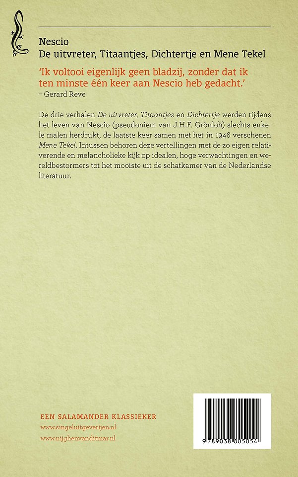 n 1918 debuteerde Nescio (pseudoniem van J.H.F. Grönloh) in boekvorm met de drie verhalen De uitvreter, Titaantjes en Dichtertje. Tijdens zijn leven werden deze verhalen slechts enkele malen herdrukt, de laatste keer samen met het in 1946 verschenen Mene Tekel, maar inmiddels behoren deze vertellingen met de zo eigen relativerende en melancholieke kijk op idealen, hoge verwachtingen en wereldbestormers tot het mooiste uit de schatkamer van de Nederlandse literatuur. Een levensgeschiedenis in drie verhalen, puntig en met veel humor opgetekend door het fenomeen Nescio.