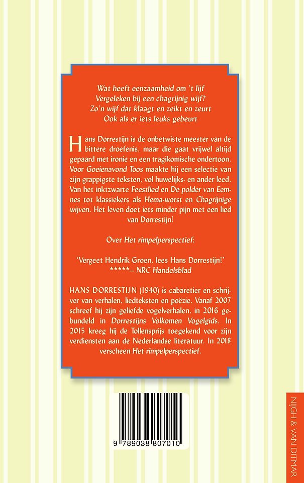 Hans Dorrestijn is de onbetwiste meester van de bittere droefenis, maar die gaat vrijwel altijd gepaard met ironie en een tragikomische ondertoon. Voor Goeienavond Toos maakte hij een selectie van zijn grappigste teksten, vol huwelijks- en ander leed. Van het inktzwarte Feestlied en De polder van Eemnes tot klassiekers alsHema-worst en Chagrijnige wijven. Het leven doet iets minder pijn met een lied van Dorrestijn!
