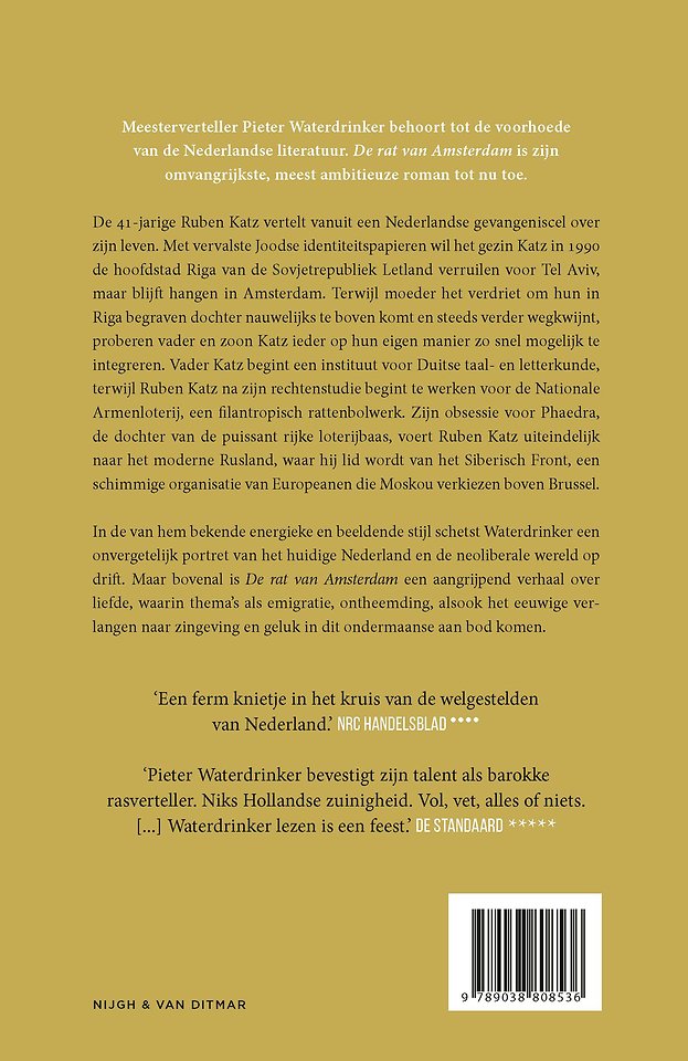 Meesterverteller Pieter Waterdrinker behoort tot de voorhoede van de Nederlandse literatuur. De rat van Amsterdam is zijn omvangrijkste, meest ambitieuze roman tot nu toe.