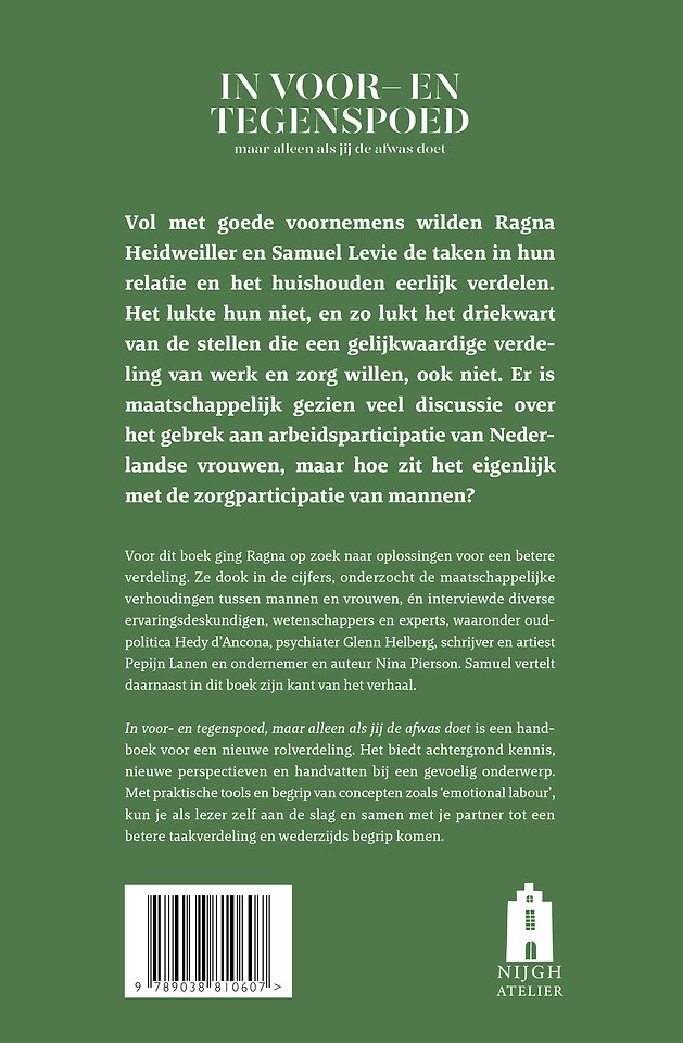 In voor- en tegenspoed, maar alleen als jij de afwas doet is een handboek voor een nieuwe rolverdeling. Het biedt achtergrond kennis, nieuwe perspectieven en handvatten bij een gevoelig onderwerp. Met praktische tools en begrip van concepten zoals ‘emotional labour’, kun je als lezer zelf aan de slag en samen met je partner tot een betere taakverdeling en wederzijds begrip komen.