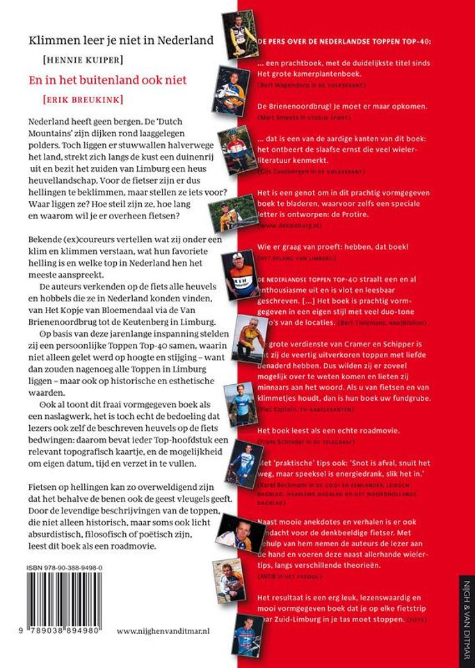 Nederland heeft geen bergen. De 'Dutch Mountains' zijn dijken rond laaggelegen polders. Toch liggen er stuwwallen halverwege het land, strekt zich langs de kust een duinenrij uit en bezit het zuiden van Limburg een heus heuvellandschap. Voor de fietser zijn er dus hellingen te beklimmen, maar stellen ze iets voor? Waar liggen ze? Hoe steil zijn ze, hoe lang en waarom wil je er overheen fietsen? Bekende (ex)coureurs vertellen wat zij onder een klim en klimmen verstaan, wat hun favoriete helling is en welke top in Nederland hen het meeste aanspreekt.