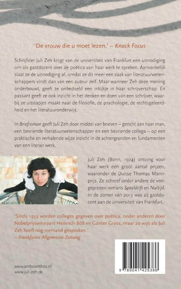In 'Briefroman' geeft Juli Zeh, een van de meest toonaangevende Europese schrijvers van dit moment, een inkijkje in haar schrijverschap. Zeh is bekend van haar romans 'Speeldrift' en 'Nultijd' en ontving voor haar werk een groot aantal prijzen. Door middel van brieven gericht aan haar man, een bevriende literatuurwetenschapper en een bevriende collega geeft ze op een praktische en verhalende wijze inzicht in de manier waarop haar literatuur tot stand komen. Daarnaast gaat 'Briefroman' in op het denken en doen van een schrijver, waarbij ze uitstapjes maakt naar de filosofie, de psychologie, de rechtsgeleerdheid en het literatuuronderwijs.