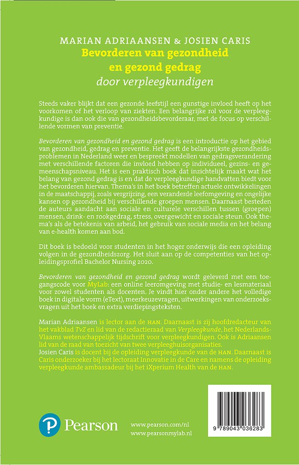 Ook thema’s als de betekenis van arbeid, het gebruik van sociale media en het belang van e-health komen aan bod. Dit boek is bedoeld voor studenten in het hoger onderwijs die een opleiding volgen in de gezondheidszorg. Het sluit aan op de competenties van het op leidingsprofiel Bachelor Nursing 2020. Bevorderen van gezondheid en gezond gedrag wordt geleverd met een toegangscode voor MyLab: een online leeromgeving met studie- en lesmateriaal voor zowel studenten als docenten. Je vindt hier onder andere het volledige boek in digitale vorm (eText), meerkeuzevragen, uitwerkingen van onderzoeksvragen uit het boek en extra verdiepingsteksten.