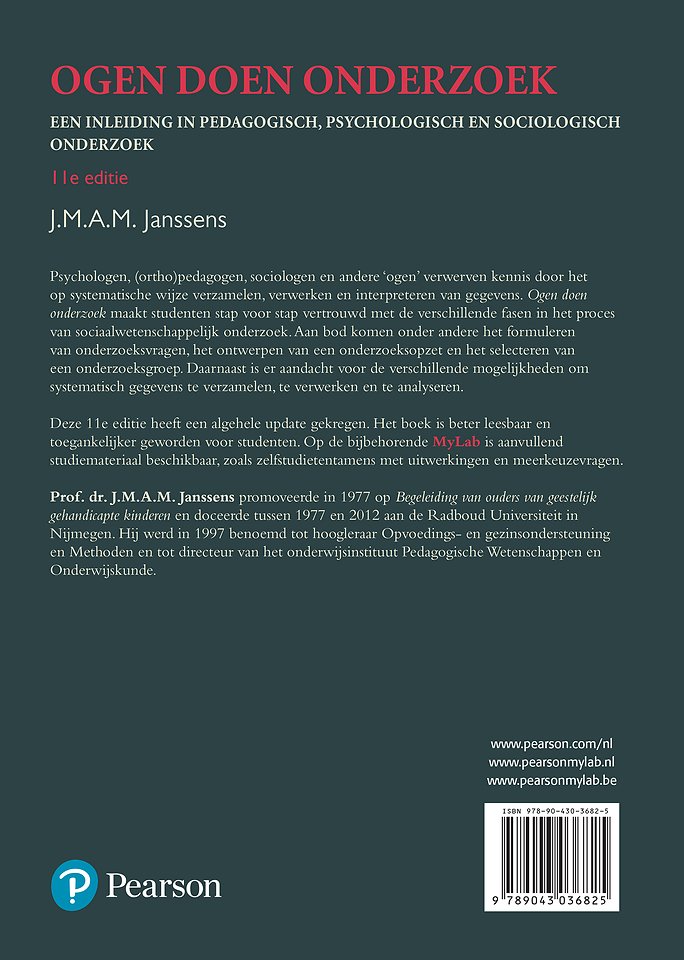 Psychologen, (ortho)pedagogen, sociologen en andere ‘ogen’ verwerven kennis door het op systematische wijze verzamelen, verwerken en interpreteren van gegevens. Ogen doen onderzoek maakt studenten stap voor stap vertrouwd met de verschillende fasen in het proces van sociaalwetenschappelijk onderzoek. Aan bod komen onder andere het formuleren van onderzoeksvragen, het ontwerpen van een onderzoeksopzet en het selecteren van een onderzoeksgroep. Daarnaast is er aandacht voor de verschillende mogelijkheden om systematisch gegevens te verzamelen, te verwerken en te analyseren.