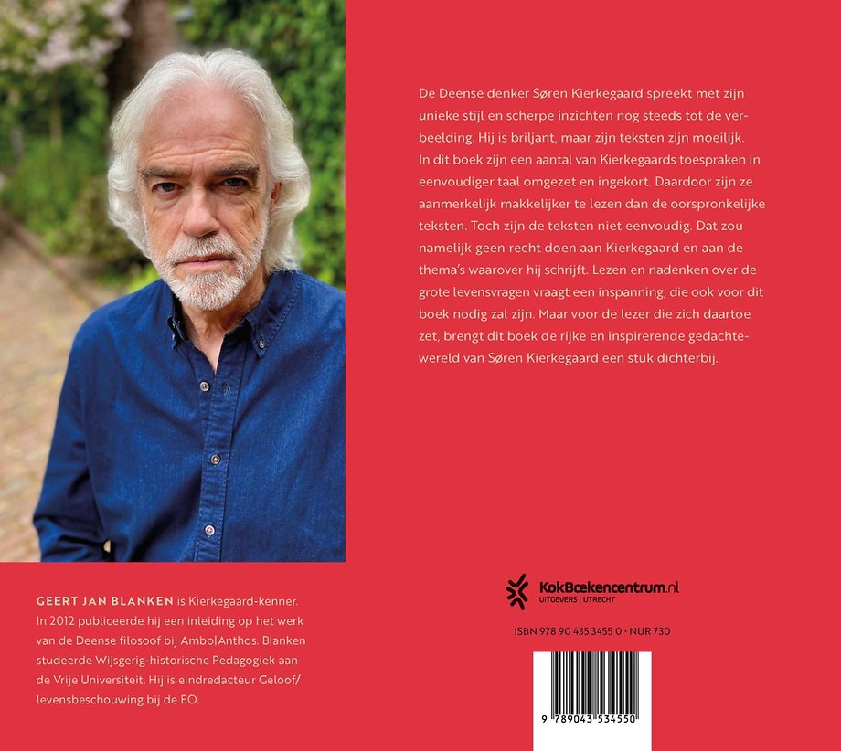 De Deense denker Søren Kierkegaard spreekt met zijn unieke stijl en scherpe inzichten nog steeds tot de verbeelding. Hij is briljant, maar zijn teksten zijn moeilijk. In dit boek zijn een aantal van Kierkegaards toespraken in eenvoudiger taal omgezet en ingekort. Daardoor zijn ze aanmerkelijk makkelijker te lezen dan de oorspronkelijke teksten. Toch zijn de teksten niet eenvoudig. Dat zou namelijk geen recht doen aan Kierkegaard en aan de thema’s waarover hij schrijft. Lezen en nadenken over de grote levensvragen vraagt een inspanning, die ook voor dit boek nodig zal zijn. Maar voor de lezer die zich daartoe zet, brengt dit boek de rijke en inspirerende gedachtewereld van Søren Kierkegaard een stuk dichterbij.