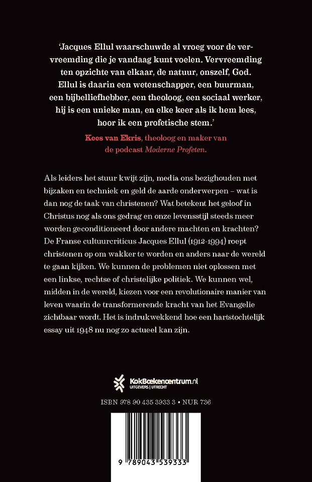 ‘Staan in de wereld van nu’ van Jacques Ellul is een hertaling van het boek dat oorspronkelijk werd uitgegeven in 1948. Maar hoewel het uit 1948 komt, is het indrukwekkend hoe dit hartstochtelijke essay nu nog zo actueel kan zijn. Als leiders het stuur kwijt zijn, media ons bezighouden met bijzaken, en techniek en geld de aarde onderwerpen – wat is dan nog de taak van christenen? Wat betekent het revolutionaire geloof in Christus als donkere wolken zich samenpakken boven de kerk en ons land, maar ook boven de hele aarde? Jacques Ellul was filosoof, socioloog, theoloog en hoogleraar in het recht. Hij stond bekend als de man die alles heeft voorzien en zijn essay leert christenen hoe ze moeten staan in deze wereld.