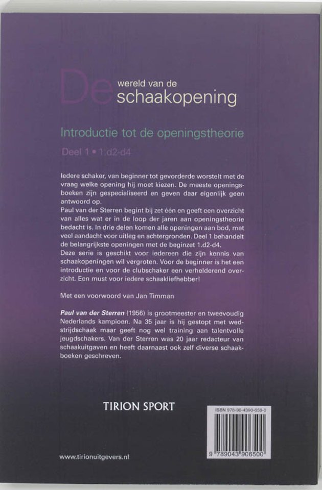 Iedere schaker, van beginner tot gevorderde worstelt met de vraag welke opening hij moet kiezen. De meeste openingsboeken zijn gespecialiseerd en geven daar eigenlijk geen antwoord op. Paul van der Sterren begint bij zet één en geeft een overzicht van alles wat er in de loop der jaren aan openingstheorie bedacht is. In drie delen komen alle openingen aan bod, met veel aandacht voor uitleg en achtergronden. Deel 1 behandelt de belangrijkste openingen met de beginzet 1.d2-d4. Deze serie is geschikt voor iedereen die zijn kennis van schaakopeningen wil vergroten. Voor de beginner is het een introductie en voor de clubschaker een verhelderen overzicht.