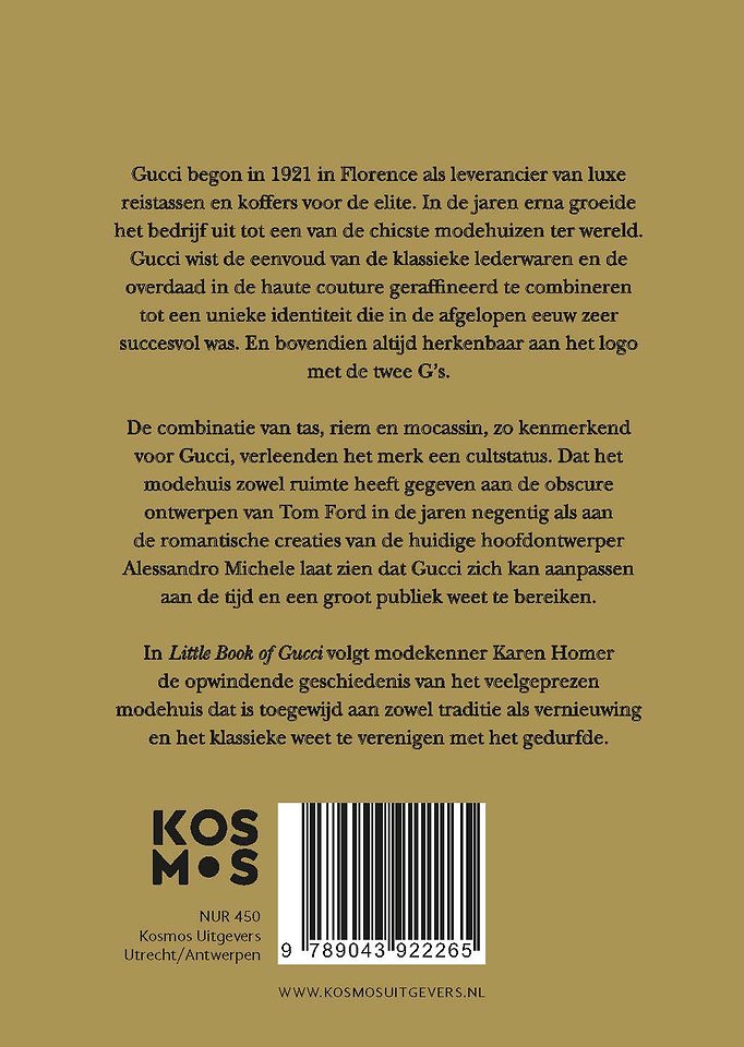 In ‘Little Book of Gucci’ volgt modekenner Karen Homer de opwindende geschiedenis van het veelgeprezen modehuis dat is toegewijd aan zowel traditie als vernieuwing. Gucci begon in 1921 in Florence als leverancier van luxe reistassen en koffers voor de elite. IN de jaren erna groeide het bedrijf uit tot een van de chicste modehuizen ter wereld.