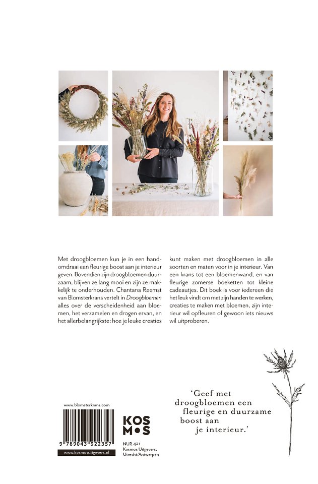 Maak samen met Chantana Reemst van Blomsterkrans de mooiste creaties met gedroogde bloemen. Droogbloemen zijn duurzaam, blijven lang mooi en zijn eenvoudig te onderhouden. In de jaren zeventig en tachtig waren ze helemaal in, daarna vergaarden ze stof en verdwenen uit de woonkamer. Maar kijk nu: droogbloemen zijn bezig aan een spectaculaire comeback. In dit prachtige boek staat alles over welke bloemen geschikt zijn om te drogen, en hoe je ze verwerkt tot mooie interieuritems.