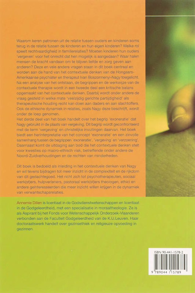Waarom keren patronen uit de relatie tussen ouders en kinderen soms terug in de relatie tussen de kinderen en hun eigen kinderen? Welke rol spelt rechtvaardigheid in familierelaties? Moeten kinderen hun ouders 'vergeven' voor het onrecht dat hen mogelijk is aangedaan? Waar halen mensen de kracht vandaan om te blijven liefde en zorg geven aan anderen? Deze en vele andere vragen staan in dit boek centraal en worden aan de hand van het contextuele denken van de Hongaars- Amerikaanse psychiater en therapeut Ivan Boszormenyi-Nagy toegelicht. Na een analyse van het ontstaan, de begrippen en de werkwijze van de contextuele therapie wordt in een tweede deel een kritische balans opgemaakt van het contextuele denken. Daarbij wordt onder andere de vraag gesteld in welke mate 'veelzijdig gerichte partijdigheid' als therapeutische houding recht kan doen aan daders en aan slachtoffers. Ook de ethische dynamiek in relaties, zoals Nagy deze beschrijft, wordt onder de loep genomen.