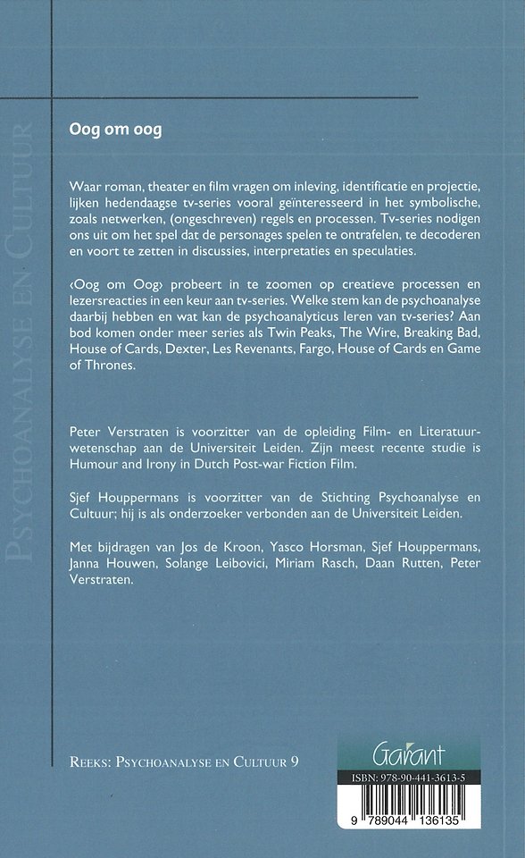 'Oog om Oog' zoomt in op creatieve processen en lezersreacties in een keur aan tv-series. Welke stem kan de psychoanalyse daarbij hebben en wat kan de psychoanalyticus leren van tv-series? Aan bod komen onder meer series als Twin Peaks, The Wire, Breaking Bad, House of Cards, Dexter, Les Revenants, Fargo en Game of Thrones.