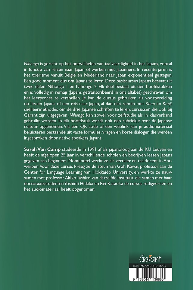 Deze basiscursus Japans bestaat uit twee delen: Nihongo 1 en Nihongo 2. Elk deel bestaat uit tien hoofdstukken en is volledig in rōmaji (Japans getranscribeerd in ons alfabet) geschreven om het leerproces te versnellen. Je kan de cursus gebruiken als voorbereiding op lessen Japans of een reis naar Japan, al dan niet samen met Kana en Kanji: snelleermethodes om de drie Japanse schriften te leren, cursussen die ook bij Garant zijn uitgegeven.
