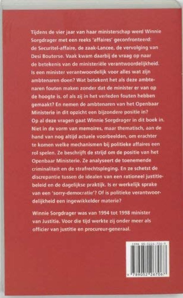 Tijdens de vier jar van haar ministerschap werd Winnie Sorgdrager met een reeks 'affaires' geconfronteerd: de Securitel-affaire, de zaak-Lancee, de vervolging van Desi Bouterse. Vaak kwam daarbij de vraag op naar de betekenis van de ministeri? verantwoordelijkheid. Is een minister verantwoordelijk voor alles wat zijn ambtenaren doen? Wat betekent het als deze ambtenaren fouten maken zonder dat de minister er van op de hoogte is, of als zij in het verleden fouten hebben gemaakt? En nemen de ambtenaren van het Openbaar Ministerie in dit opzicht een bijzondere positie in? Op al deze vragen gaat Winnie Sorgdrager in dit boek in. Niet in de vorm van memoires, maar thematisch, aan de hand van nog altijd actuele voorbeelden om erachter te komen welke mechanismen bij politieke affaires een rol spelen. Ze beschrijft de strijd om de positie van het Openbaar Ministerie. Ze analyseert de toenemende criminaliteit en de strafrechtspleging. En ze schetst de discrepantie tussen de idealen van een rationeel justitie-beleid en de dagelijkse praktijk. Is er werkelijk sprake van een 'sorry-democratie'? Of is politieke verantwoordelijkheid een ingewikkelde materie?
