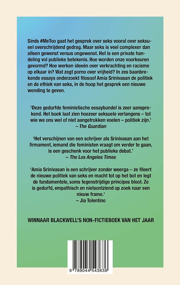 ‘Amia Srinivasan is een schrijver zonder weerga – ze fileert de nieuwe politiek van seks en macht tot op het bot en legt de fundamentele, soms tegenstrijdige principes bloot. Ze is gedurfd, empathisch en nietsontziend op zoek naar een nieuw frame.’ – Jia Tolentino
