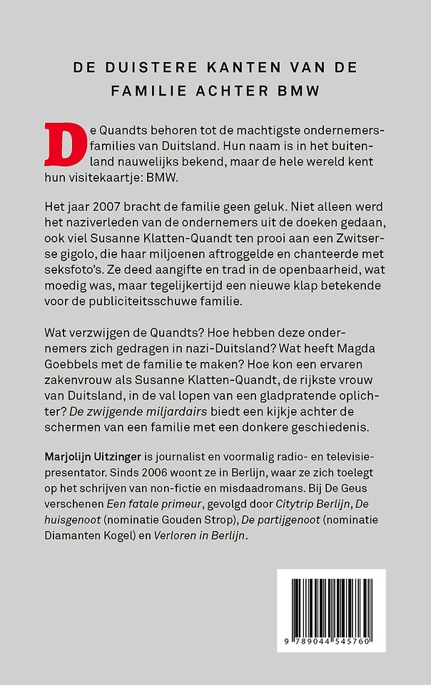 Wat verzwijgen de Quandts? Hoe hebben deze ondernemers zich gedragen in nazi-Duitsland? Wat heeft Magda Goebbels met de familie te maken? Hoe kon een ervaren zakenvrouw als Susanne Klatten-Quandt, de rijkste vrouw van Duitsland, in de val lopen van een gladpratende oplichter? De zwijgende miljardairs biedt een kijkje achter de schermen van een familie met een donkere geschiedenis.