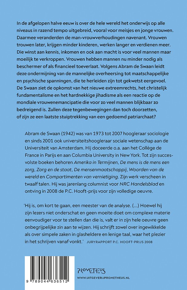 Volgens Abram de Swaan leidt deze ondermijning van de mannelijke overheersing tot maatschappelijke en psychische spanningen, die te herleiden zijn tot de kwetsuur van het mannelijk eergevoel: een collectieve en persoonlijke ‘narcistische’ krenking. De Swaan ziet de opkomst van het nieuwe extreem rechts, het christelijk fundamentalisme en het hardnekkige jihadisme als een reactie op de mondiale vrouwenemancipatie die voor zo veel mannen blijkbaar zo bedreigend is. Zullen deze bewegingen dan toch doorzetten, of zijn ze een laatste stuiptrekking van een gedoemd patriarchaat?