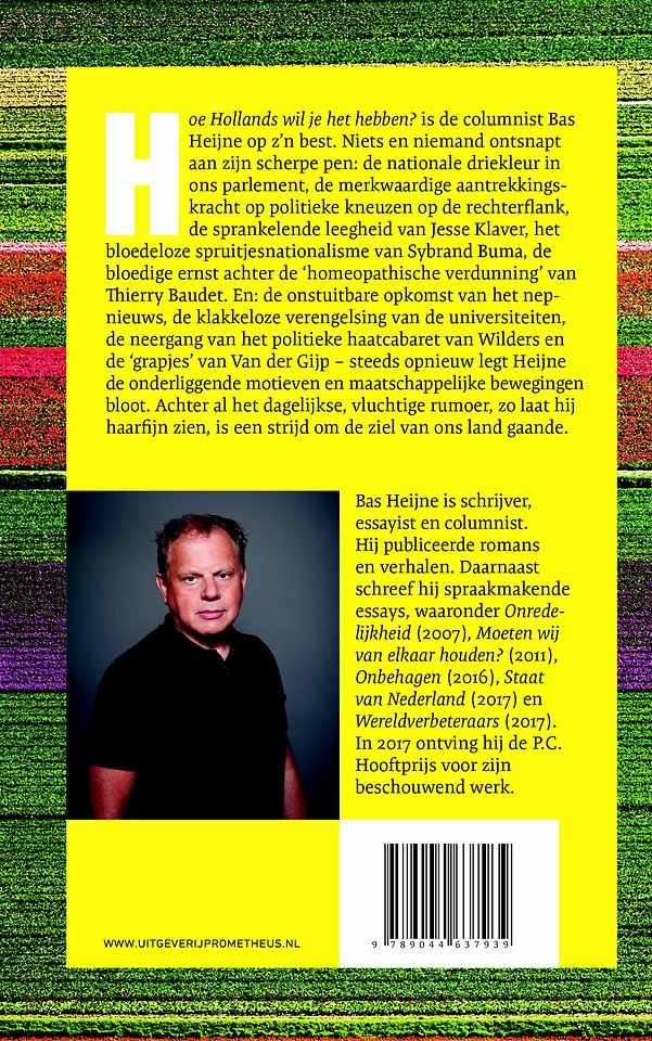 Hoe Hollands wil je het hebben? is de columnist Bas Heijne op z’n best. Niets en niemand ontsnapt aan zijn scherpe pen: de nationale driekleur in ons parlement, de merkwaardige aantrekkingskracht op politieke kneuzen op de rechterflank, de sprankelende leegheid van Jesse Klaver, het bloedeloze spruitjesnationalisme van Sybrand Buma, de bloedige ernst achter de ‘homeopathische verdunning’ van Thierry Baudet.