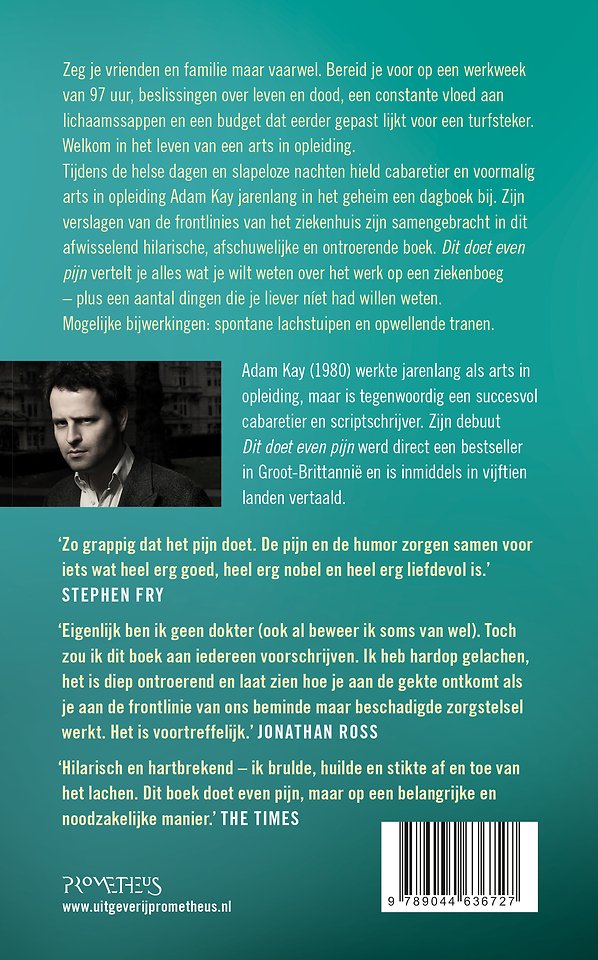 Adam Kay (1980) werkte jarenlang als arts in opleiding, maar is tegenwoordig een succesvol cabaretier en scriptschrijver. Zijn debuut Dit doet even pijn werd direct een bestseller in Groot-Brittannië en is inmiddels in vijftien landen vertaald.