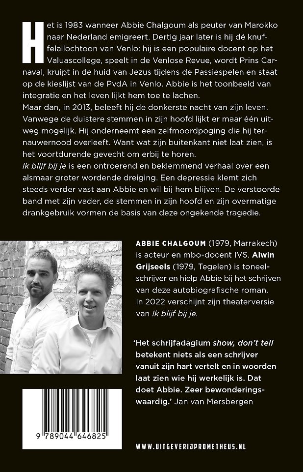 Abbie Chalgoum (1979, Marrakech) is acteur en mbo-docent IVS. Alwin Grijseels (1979, Tegelen) is toneelschrijver en hielp Abbie bij het schrijven van deze autobiografische roman. In 2022 verschijnt zijn theaterversie van Ik blijf bij je.