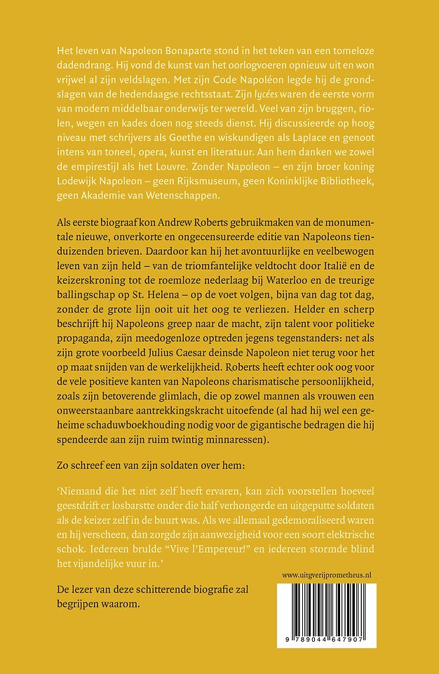Als eerste biograaf kon Andrew Roberts gebruik maken van de monumentale nieuwe editie van Napoleons tienduizenden brieven, de eerste onverkorte en ongecensureerde. Daardoor kan hij het avontuurlijke en veelbewogen leven van zijn held - van de triomfantelijke veldtocht door Italië en de keizerskroning tot de roemloze nederlaag bij Waterloo en de treurige ballingschap op St. Helena - op de voet volgen, bijna van dag tot dag, zonder de grote lijn ooit uit het oog te verliezen. Helder en scherp beschrijft hij Napoleons greep naar de macht, zijn talent voor politieke propaganda, zijn meedogenloze optreden jegens tegenstanders: net als zijn grote voorbeeld Julius Caesar deinsde Napoleon niet terug voor het op maat snijden van de werkelijkheid. Roberts heeft echter ook oog voor de vele positieve kanten van Napoleons charismatische persoonlijkheid, zoals zijn betoverende glimlach, die op zowel mannen als vrouwen een onweerstaanbare aantrekkingskracht uitoefende (al had hij wel een geheime schaduwboekhouding nodig voor de gigantische gedragen die hij spendeerde aan zijn ruim twintig minnaressen).
