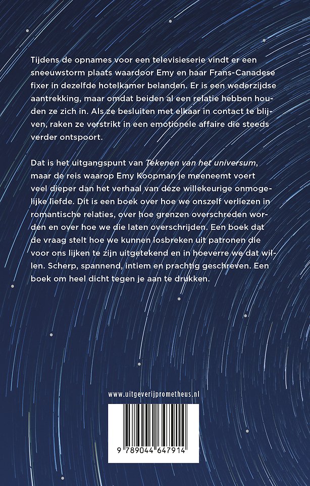 Dat is het uitgangspunt van Tekenen van het universum, maar de reis waarop Emy Koopman je meeneemt voert veel dieper dan het verhaal van deze willekeurige onmogelijke liefde. Dit is een boek over hoe we onszelf verliezen in romantische relaties, over hoe grenzen overschreden worden en over hoe we die laten overschrijden. Een boek dat de vraag stelt hoe we kunnen losbreken uit patronen die voor ons lijken te zijn uitgetekend en in hoeverre we dat willen. Scherp, spannend, intiem en prachtig geschreven. Een boek om heel dicht tegen je aan te drukken.