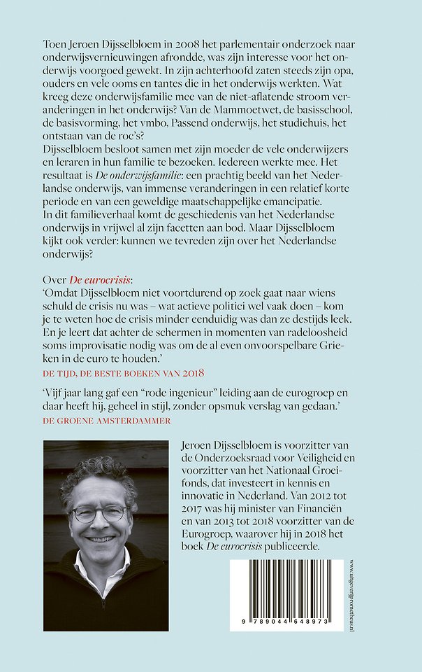 Dijsselbloem komt uit een onderwijsfamilie waarvan opeenvolgende generaties te maken hadden met de niet-aflatende stroom veranderingen die door het onderwijs spoelde. Wat kregen zij eigenlijk mee van de Mammoetwet, de basisschool, de basisvorming, de fusies tot grote scholengemeenschappen, de invoering van het vmbo, passend onderwijs, het studiehuis, het ontstaan van de roc’s, enzovoorts?