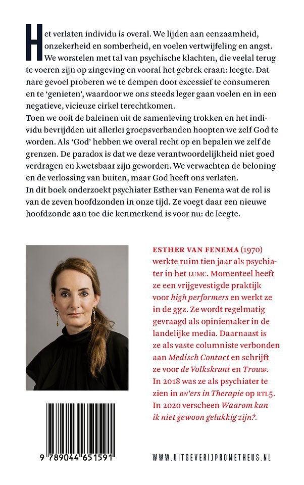 In dit boek onderzoekt psychiater Esther van Fenema wat de rol is van de zeven hoofdzonden in onze tijd. Ze voegt daar een nieuwe hoofdzonde aan toe die kenmerkend is voor nu: de leegte.