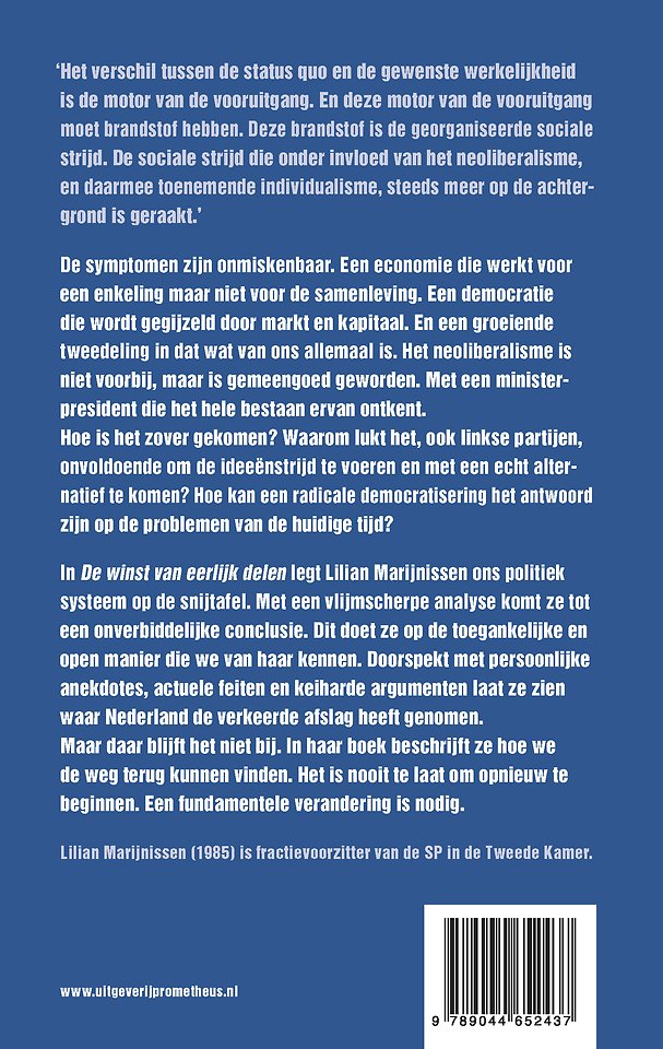In De winst van eerlijk delen legt Lilian Marijnissen ons politiek systeem op de snijtafel. Met een vlijmscherpe analyse komt ze tot een onverbiddelijke conclusie. Dit doet ze op de toegankelijke en open manier die we van haar kennen. Doorspekt met persoonlijke anekdotes, actuele feiten en keiharde argumenten laat ze zien waar Nederland de verkeerde afslag heeft genomen.