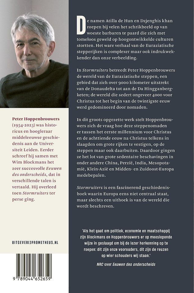In Stormruiters betreedt Peter Hoppenbrouwers de wereld van de nomaden op de Euraziatische steppen, een gebied dat zich uitstrekt van de Donaudelta tot aan de Da Hingganbergketen. Hoppenbrouwers duikt in de intrigerende geschiedenis van de nomadische samenlevingen die de steppen van 7000 voor Christus tot het begin van de twintigste eeuw domineerden. In dit groots opgezette werk laat Hoppenbrouwers zijn licht schijnen op de steppevolkeren die het lot van grote beschavingen in onder andere China, Perzië, India, Mesopotamië en Klein-Azië medebepaalden. Stormruiters is een fascinerend geschiedenisboek waarin West-Europa eens niet centraal staat, maar slechts een uithoek is van de wereld die wordt beschreven.