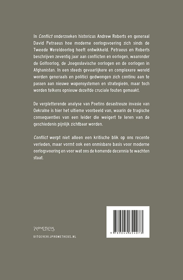 In Conflict onderzoeken prijswinnend historicus Andrew Roberts en generaal David Petraeus, voormalig CIA-directeur en een van de meest vooraanstaande militaire strategen van onze tijd, de ontwikkeling van moderne oorlogsvoering sinds de Tweede Wereldoorlog. Zeventig jaar aan conflicten en oorlogen, waaronder de Golfoorlog, de Joegoslavische oorlogen en de oorlogen in Afghanistan, schetsen een indrukwekkend beeld van een steeds gevaarlijkere en complexere wereld waarin generaals en politici gedwongen worden zich continu aan te passen aan nieuwe wapensystemen en strategieën, maar toch telkens opnieuw dezelfde cruciale fouten maken.