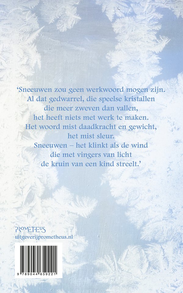 ‘Sneeuwen zou geen werkwoord mogen zijn. Al dat gedwarrel, die speelse kristallen die meer zweven dan vallen, het heeft niets met werk te maken. Het woord mist daadkracht en gewicht, het mist sleur.