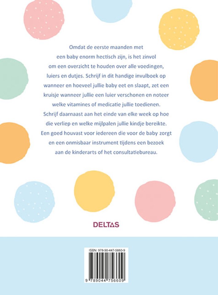 Omdat de eerste maanden met een baby enorm hectisch zijn, is het zinvol om een overzicht te houden over alle voedingen, luiers en dutjes. Schrijf in dit handige invulboek op wanneer en hoeveel jullie baby eet en slaapt, zet een kruisje wanneer jullie een luier verschonen en noteer welke vitamines of medicatie jullie toedienen. Schrijf daarnaast aan het einde van elke week op hoe die verliep en welke mijlpalen jullie kindje bereikte. Een goed houvast voor iedereen die voor de baby zorgt en een onmisbaar instrument tijdens een bezoek aan de kinderarts of het consultatiebureau. Gebonden uitvoering met leeslint.