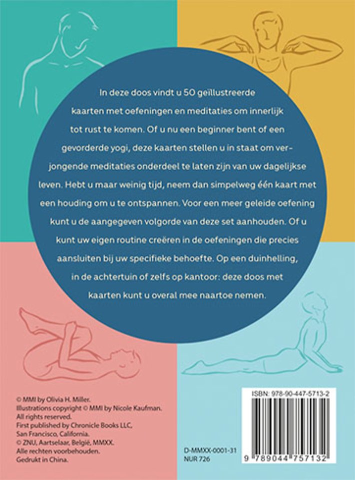 In deze doos vindt u 50 geïllustreerde kaarten met oefeningen en meditaties om innerlijk tot rust te komen. Of u nu een beginner bent of een gevorderde yogi, deze kaarten stellen u in staat om verjongende meditaties onderdeel te laten zijn van uw dagelijkse leven. Hebt u maar weinig tijd, neem dan simpelweg één kaart met een houding om u te ontspannen. Voor een meer geleide oefening kunt u de aangegeven volgorde van deze set aanhouden. Of u kunt uw eigen routine creëren in de oefeningen die precies aansluiten bij uw specifieke behoefte. Op een duinhelling, in de achtertuin of zelfs op kantoor: deze doos met kaarten kunt u overal mee naartoe nemen.