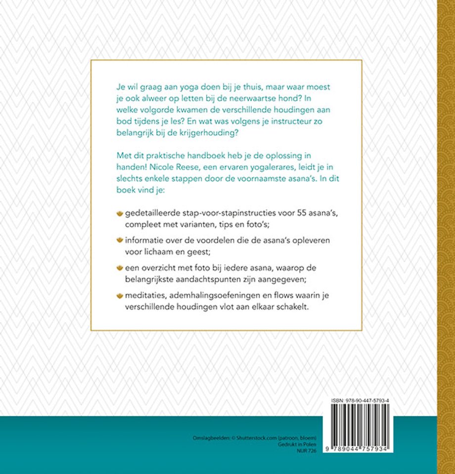 Je wil graag aan yoga doen bij je thuis, maar waar moest je ook alweer op letten bij de neerwaartse hond? In welke volgorde kwamen de verschillende houdingen aan bod tijdens je les? Met dit praktische handboek heb je de oplossing in handen! Nicole Reese, een ervaren yogalerares, leidt je in slechts enkele stappen door de voornaamste asana's, ademhalingsoefeningen en flows waarin je verschillende houdingen vlot aan elkaar schakelt.