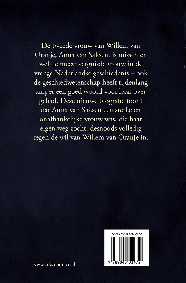Deze nieuwe biografie van de meest verguisde vrouw uit de Nederlandse geschiedenis laat zien dat Anna van Saksen in feite een sterke en onafhankelijke vrouw was. Anna’s uiteindelijk tragische lot had zij niet alleen aan zichzelf te danken, maar ook aan het gedrag van Willem van Oranje en de Nassaus. 'Anna van Saksen' laat de tragische neergang zien van een rijke en felbegeerde prinses wie letterlijk alles werd ontnomen – en het werpt een nieuw licht op Willem van Oranje.